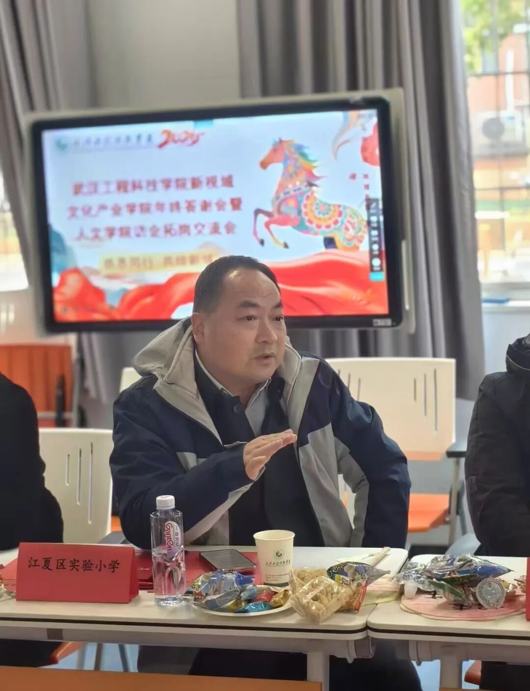武汉工程科技学院新视域文化产业学院年终答谢会暨人文学院访企拓岗交流会在1教110教室举行。党委副书记、校长助理唐军国,党委常委、校长助理胡晶晶,人文学院院长吴亚林,人文学院副院长吴海燕、郭生鼎, 江夏区教育局、江夏区图书馆、江夏区文化馆相关负责人,江夏区实验小学、第一小学、第二小学、东湖路小学 、明熙小学校长及负责人,传神语联网网络科技股份有限公司、武汉君笑文化传媒有限公司代表,以及人文学院各专业教研室主任和教师代表参加答谢交流会,活动由人文学院党总支书记张冬琦主持。大家欢聚一堂,共话教育,共商合作共赢,现场气氛热烈。