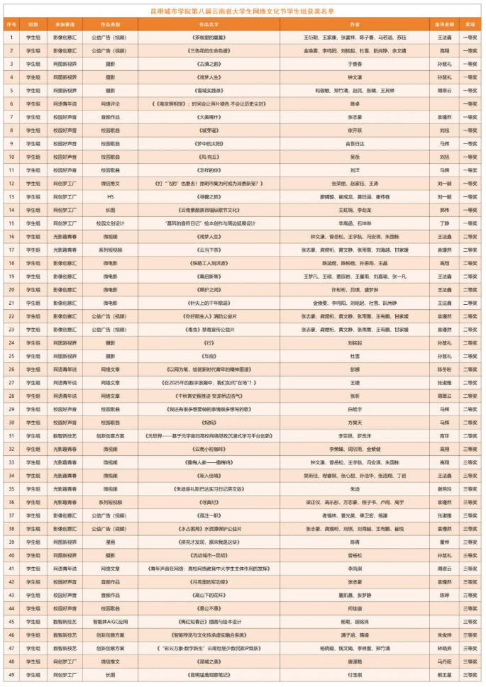 近日,第八届云南省大学生网络文化节和云南省高校网络教育优秀作品推选展示活动获奖名单正式公布。昆明城市学院在此次活动中表现优异,成果丰硕,共斩获一等奖16项、二等奖16项、三等奖20项,获奖总数再创新高,充分展现了学校在网络文化建设和网络育人方面的扎实功底与丰硕成果。