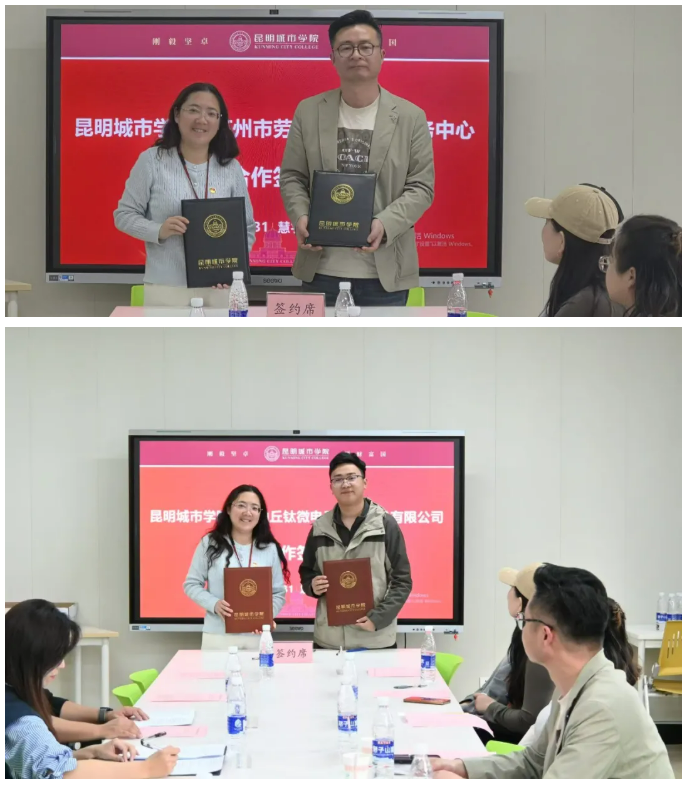 会上,昆明城市学院与苏州市劳动就业管理服务中心、昆山丘钛微电子科技股份有限公司分别签署校企合作框架协议,标志着校地合作迈出实质性步伐。双方围绕人才培养优化、就业实习基地共建、招聘协作机制等进行了务实交流,为后续合作奠定了坚实基础。