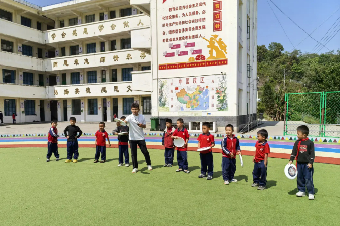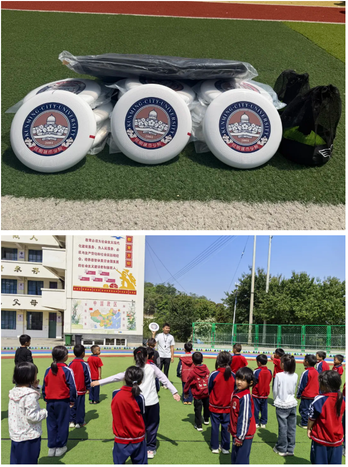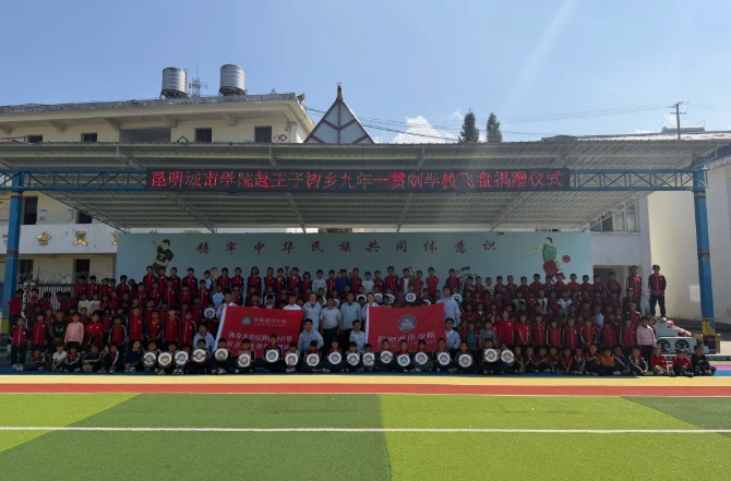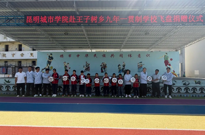 昆明城市学院组织第六批体育美育浸润计划团队奔赴陇川县王子树乡九年一贯制学校,开展“飞盘传情·共筑体育梦”飞盘捐赠暨体育帮扶活动,用青春动能与体育活力为乡村教育注入新鲜力量。