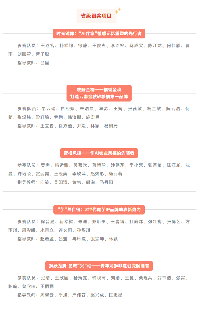 获奖项目紧密围绕国家战略需求与云南省“3815”战略发展目标,在人工智能、智慧农业、数字经济、非遗传承、绿色能源、红色文化等多个关键领域展现出极高的创新性、技术含量和应用价值,全面展现了获奖团队的卓越风采。