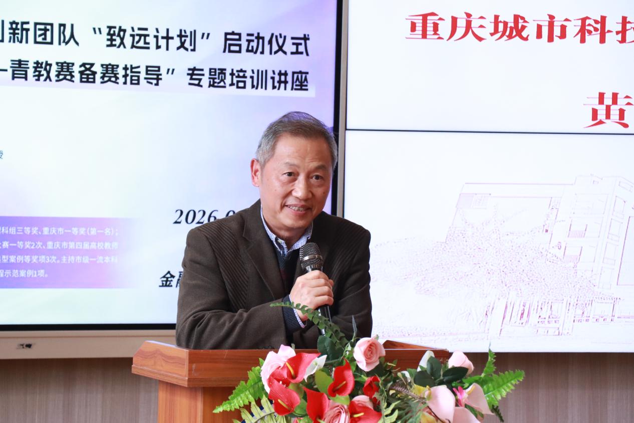 重庆城市科技学院教学创新团队“致远计划”启动仪式暨“教师教学能力提升——青教赛备赛指导”专题培训在金融仿真中心成功举办。校长黄宗明、副校长雷金辉出席,特聘专家张玲教授、重庆三峡科技大学宋晓倩副教授及首期“教学创新预备营”教师代表参加,本次活动由教务处处长王颖主持。