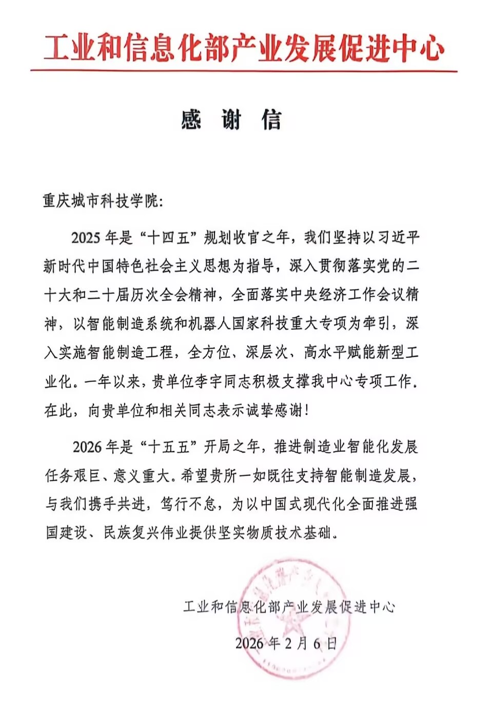 感谢信中明确指出,2025年作为“十四五”规划收官之年,工信部产业发展促进中心以智能制造系统和机器人国家科技重大专项为牵引,深入实施智能制造工程,全方位赋能新型工业化。过去一年,重庆城市科技学院电气工程与智能制造学院以扎实的专业能力、高效的协同配合,全力支撑中心专项管理工作,为智能制造国家专项的高质量落地推进提供了有力保障。工信部产业发展促进中心向学校领导和全体同志致以诚挚感谢,并对电气工程与智能制造学院党总支副书记李宇同志长期积极支持工信部专项工作,也致以衷心感谢。信中对学校提出殷切期望,希望学校在2026年“十五五”开局之年,继续携手共进、笃行不怠,为以中国式现代化全面推进强国建设、民族复兴伟业提供坚实物质技术基础。