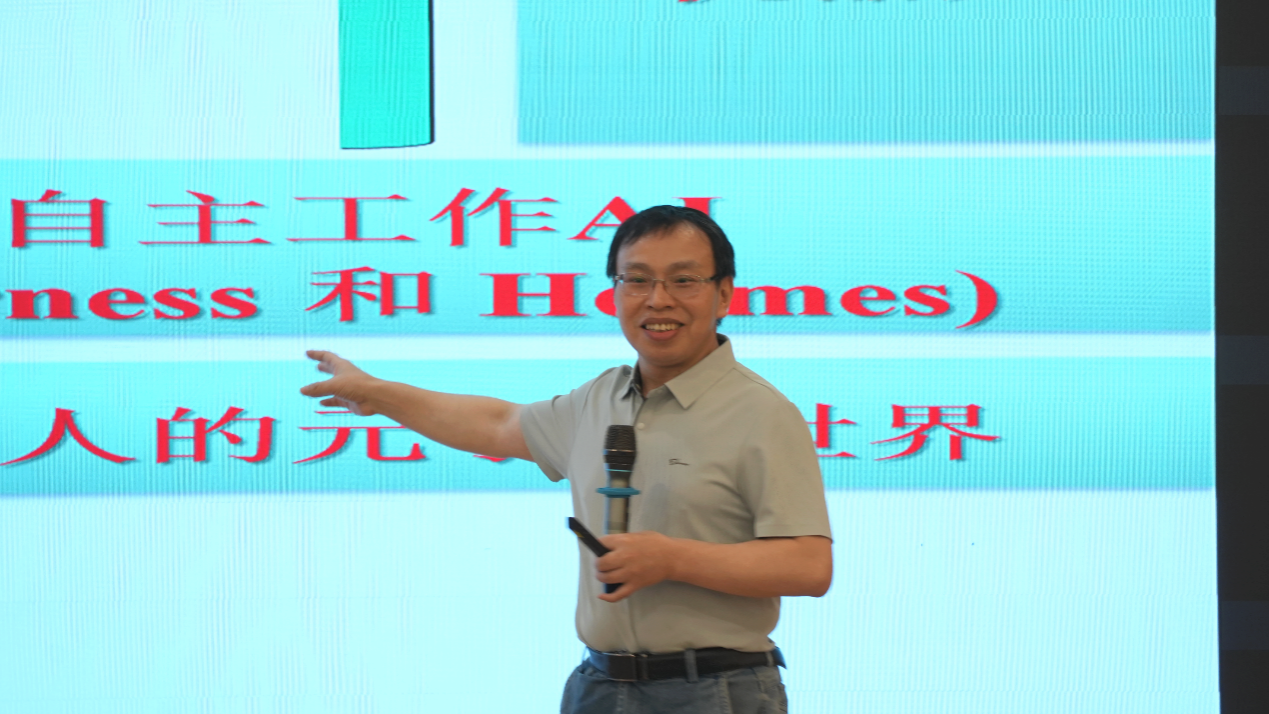 为系统讲解轮式、工业、飞行、人形机器人核心结构与电机、FOC、传感器等基础技术,南宁市海通新技术研究所所长、广西民族大学物理与电子信息学院廖义奎教授作了《自主工作机器人的几个关键技术探讨》的主题发言。廖教授详细介绍了人形机器人模仿学习、动作规划与PPO强化学习技术路径,并展望AI智能体、思维决策与类人生命机器人发展前景。讲座现场,廖教授还向在场的部分同学赠送人工智能相关产品,互动氛围热烈,有效激发了同学们投身智能技术领域的学习热情。